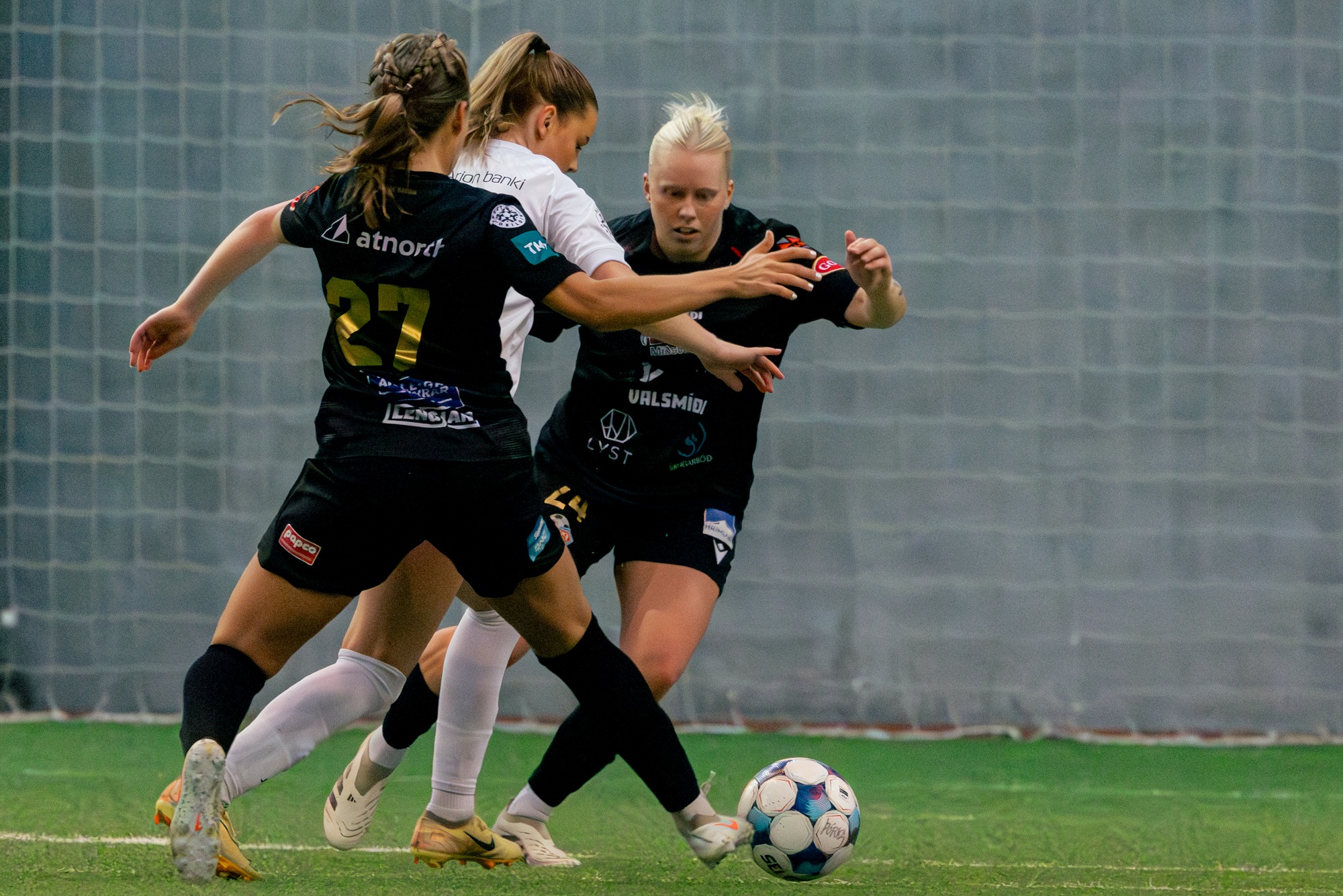 Birgitta Rún í leik með Tindastóli gegn Þór/KA í Boganum síðastliðið haust, í baráttu við Huldu Björg Hannesdóttur (24) og Henríettu Ágústsdóttur (27). Mynd: Ármann Hinrik.