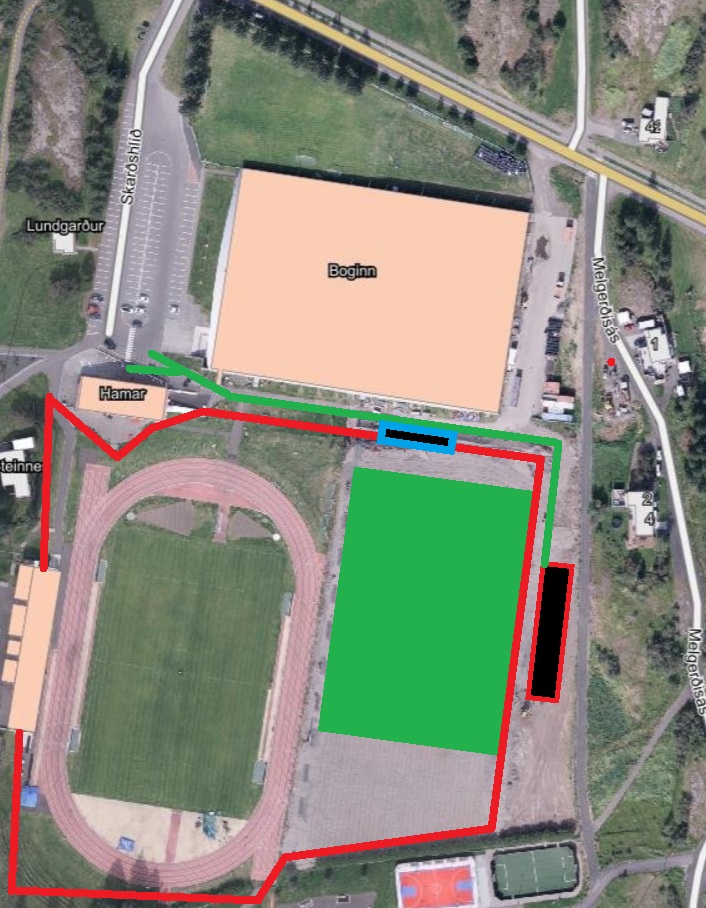 Athugið: Þegar meistaraflokksleikir eru á nýja vellinum er Þórssvæðið lokað öðrum en liðunum, dómurum, gæslufólki og starfsfólki svæðisins, afmarkað með rauðu á myndinni. Íþróttafólk og almenningur geta því ekki notað grasvöllinn eða hlaupabrautirnar frá því klukkutíma fyrir leik og þar til eftir að leik lýkur.