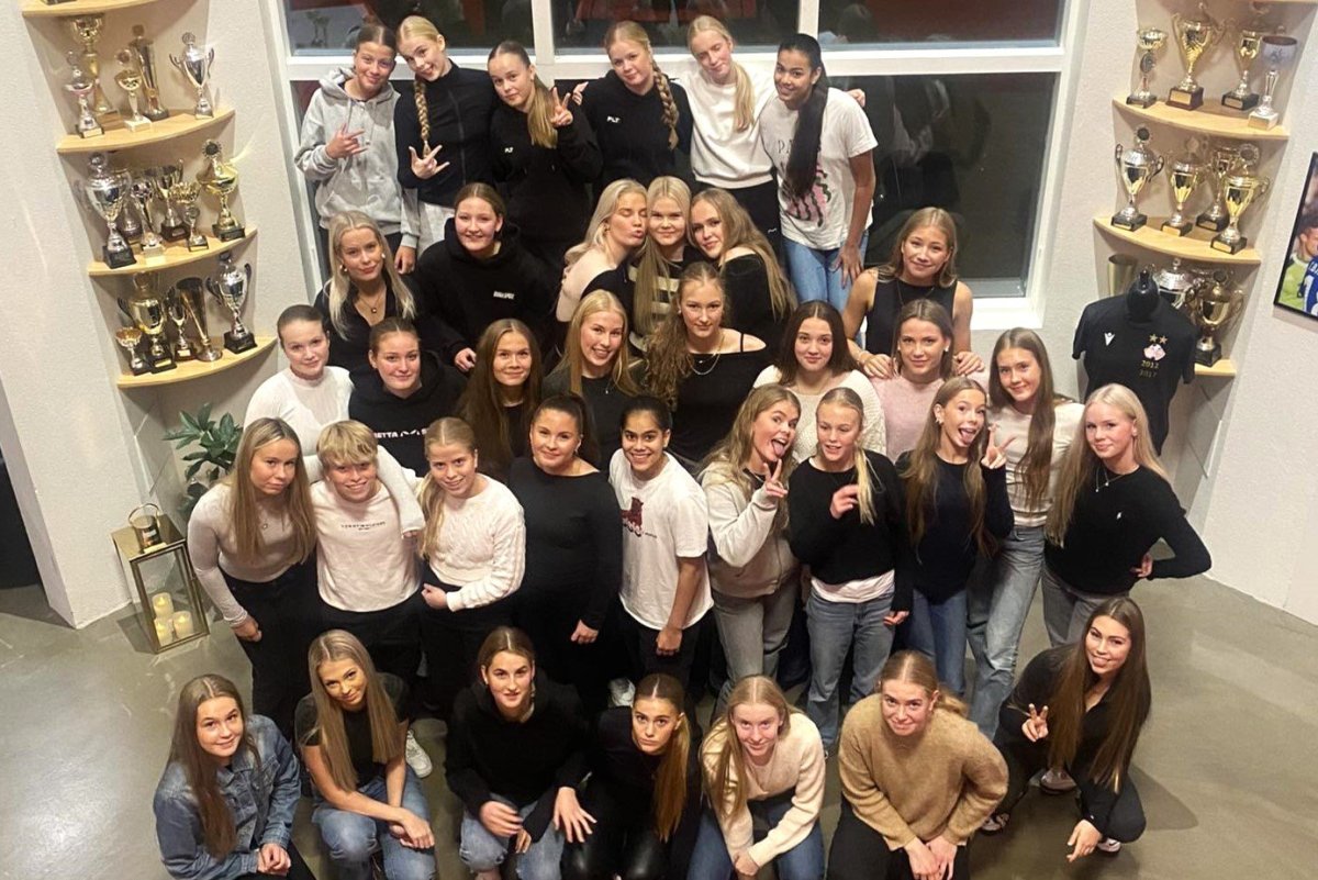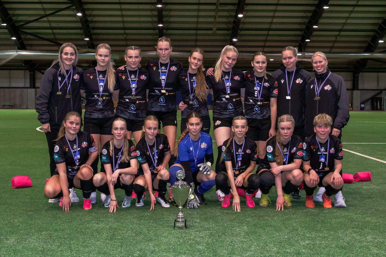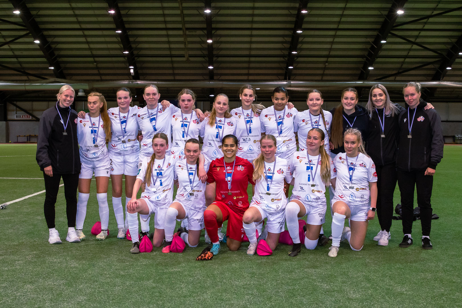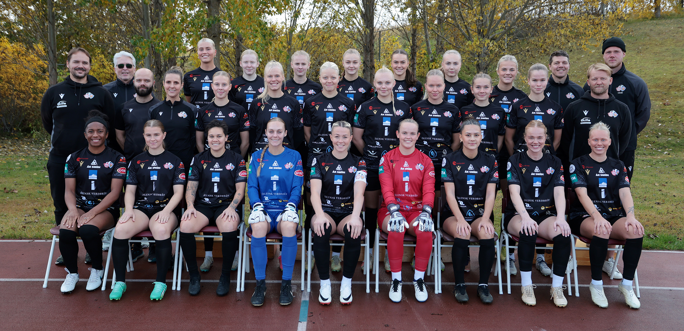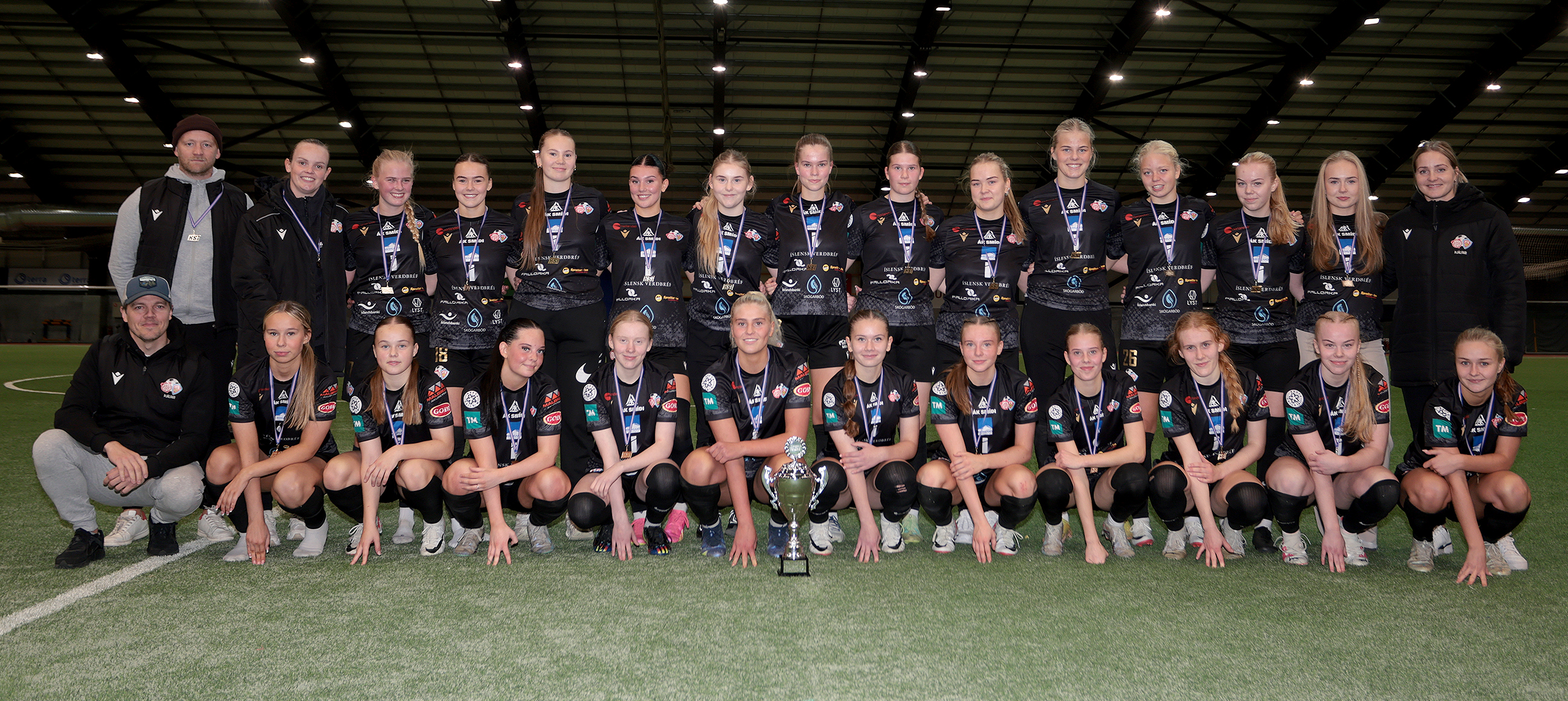 Að loknum sigri í lokaleik A-deildar. Hér eru 24 af 37 leikmönnum sem komu við sögu í leikjum liðsins í A-deildinni. Aftari röð frá vinstri: Pétur Heiðar Kristjánsson þjálfari, Harpa Jóhannsdóttir, Emelía Ósk Krüger, Bríet Jóhannsdóttir, Lilja Gull Ólafsdóttir, Rut Marín Róbertsdóttir, Hanna Klara Birgisdóttir, Amalía Árnadóttir, Ólína Helga Sigþórsdóttir, Tanía Sól Hjartardóttir, Sonja Björg Sigurðardóttir, Ísfold Marý Sigtryggsdóttir, Anna Guðný Sveinsdóttir, Angela Mary Helgadóttir og Ágústa Kristiinsdóttir þjálfari. Fremri röð frá vinstri: Birkir Hermann Björgvinsson þjálfari, Katla Bjarnadóttir, Bríet Fjóla Bjarnadóttir, Helga Dís Hafsteinsdóttir, Hildur Anna Birgisdóttir, Iðunn Rán Gunnarsdóttir fyrirliði, Kolfinna Eik Elínardóttir, Krista Dís Kristinsdóttir, Una Móeiður Hlynsdóttir, Arna Rut Orradóttir, Júlía Margrét Sveinsdóttir og Steingerður Snorradóttir.